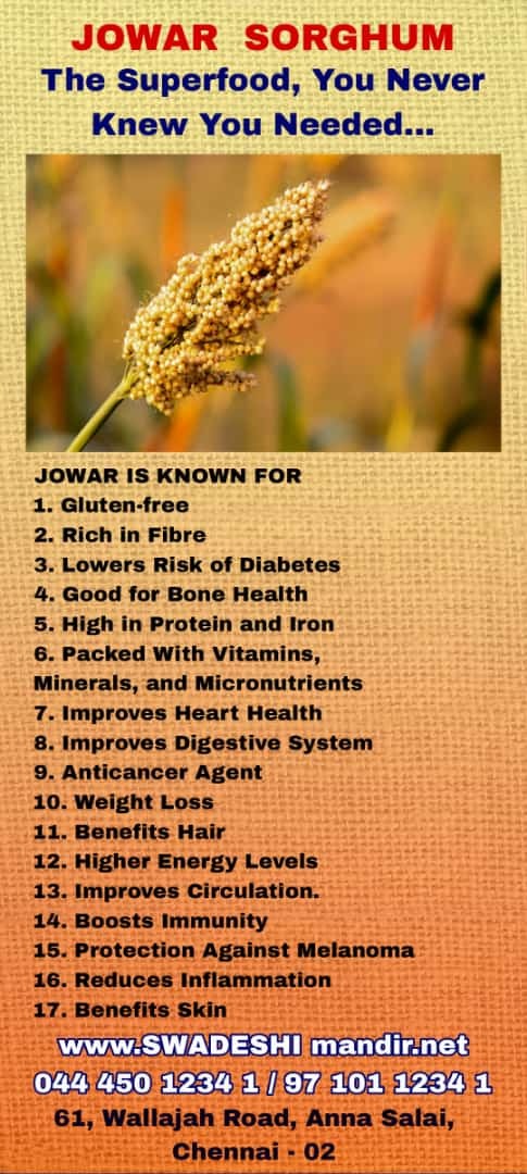 JOWAR WILL HELP LOWER THE RISK OF HEART DISEASES AND CHOLESTEROL. IT HAS CANCER-FIGHTING PROPERTIES AND IS PACKED WITH PROTEIN, CALCIUM, AND IRON.